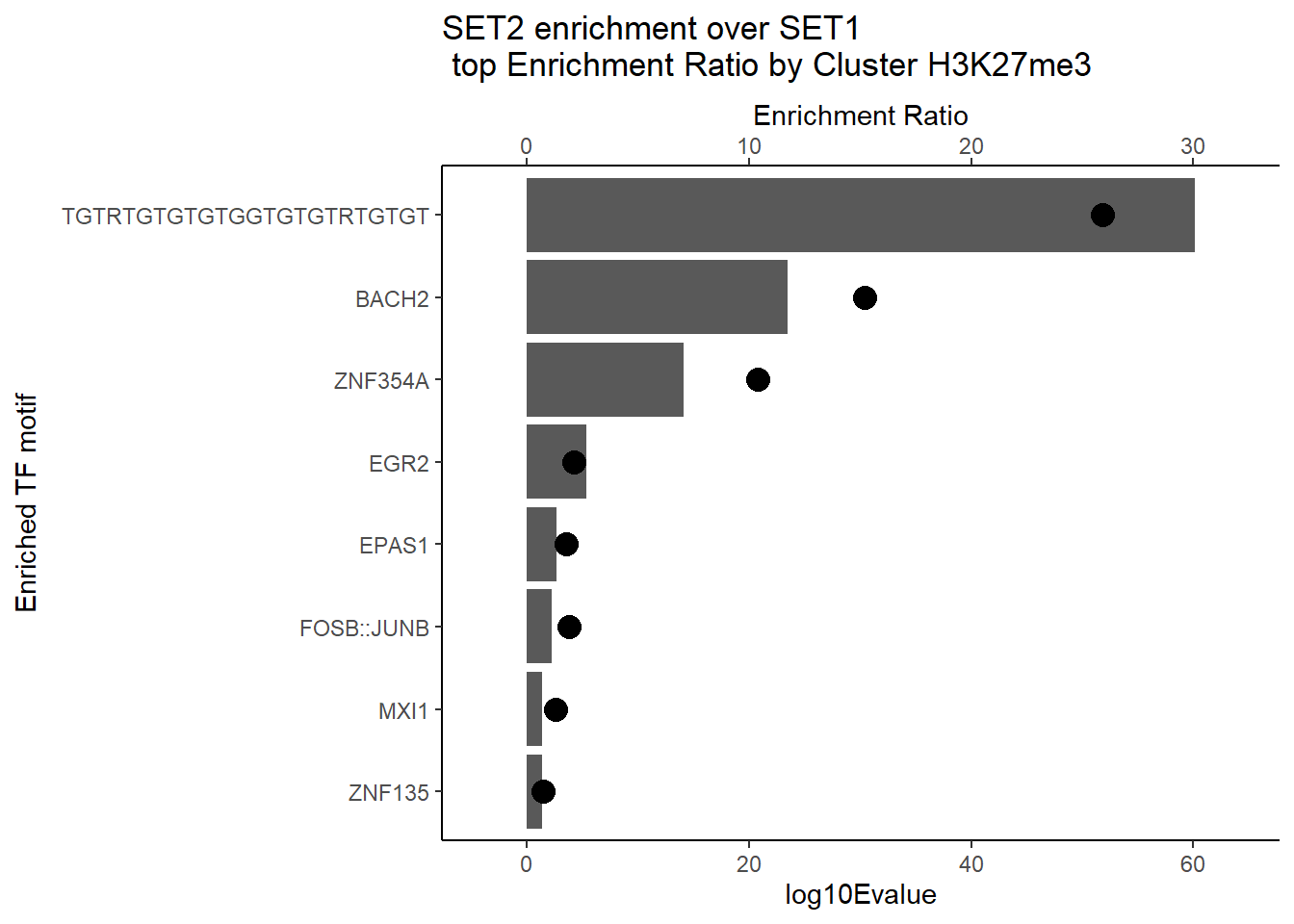 ggtitle(paste("SET2 enrichment over SET1\n top Enrichment Ratio by Cluster H3K27me3"))